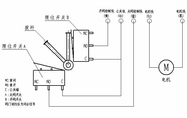 4)執行機構引出線中:黑色線為電機正極引(yǐn)出線,紅色線為電機負極引出線,黃色線為開閥到位引出線,藍(lán)色線為關閥到位引出線(xiàn),白色線為閥到位公(gōng)共線。