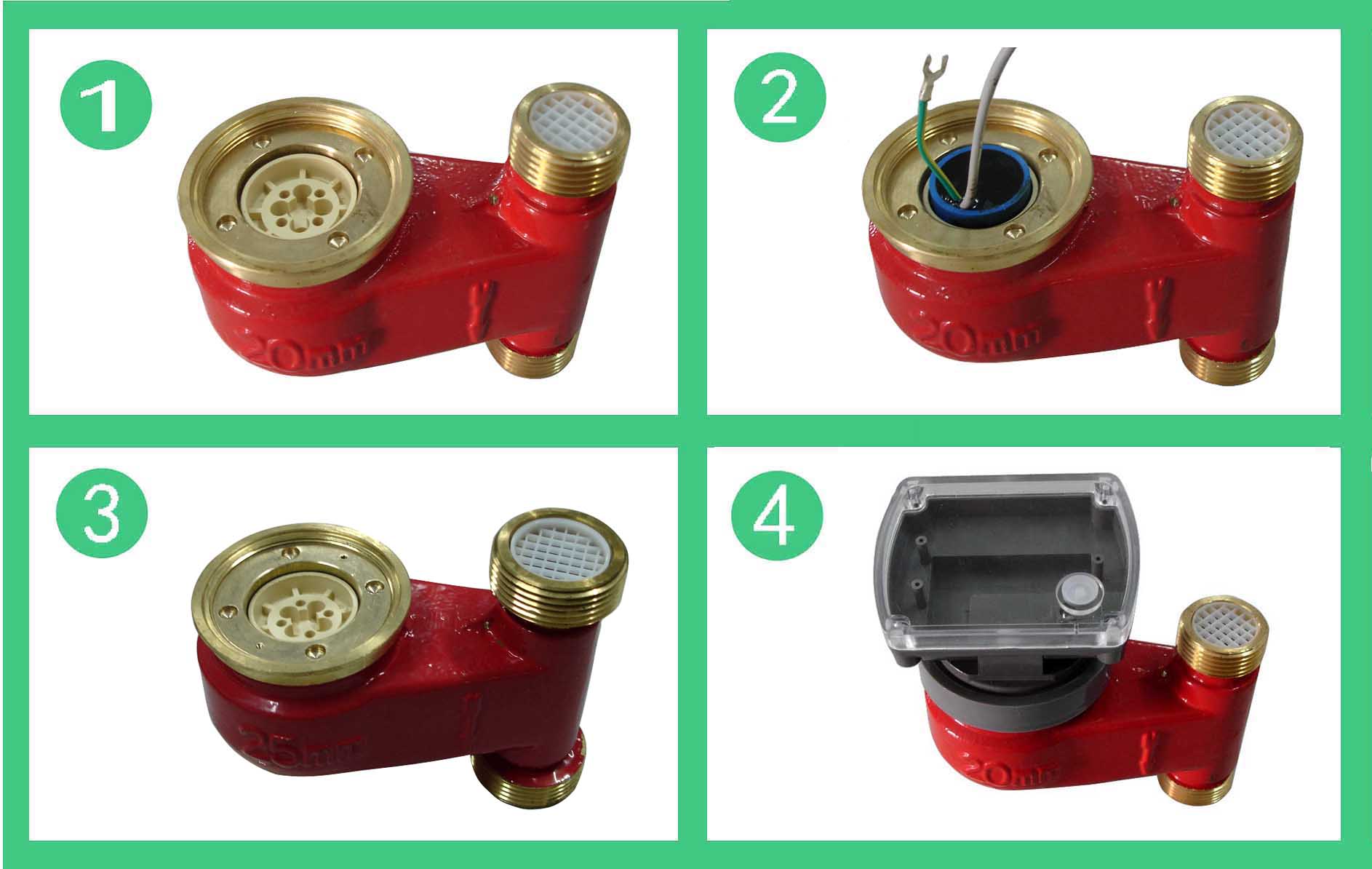 DS97TAR多流束無磁(cí)熱量表流量計的結構如圖,其工作原理是:熱水進(jìn)入流量計,經(jīng)進水導向孔衝擊計量(liàng)腔(qiāng)內的葉輪旋轉,再經出水導向孔流出流量計。葉輪上麵嵌有不鏽鋼膜片,隨葉輪(lún)旋轉,在隔板上(shàng)端接近(jìn)不鏽鋼膜片處可裝電感(gǎn)類傳感器,接受葉輪旋轉(zhuǎn)的周期信號。