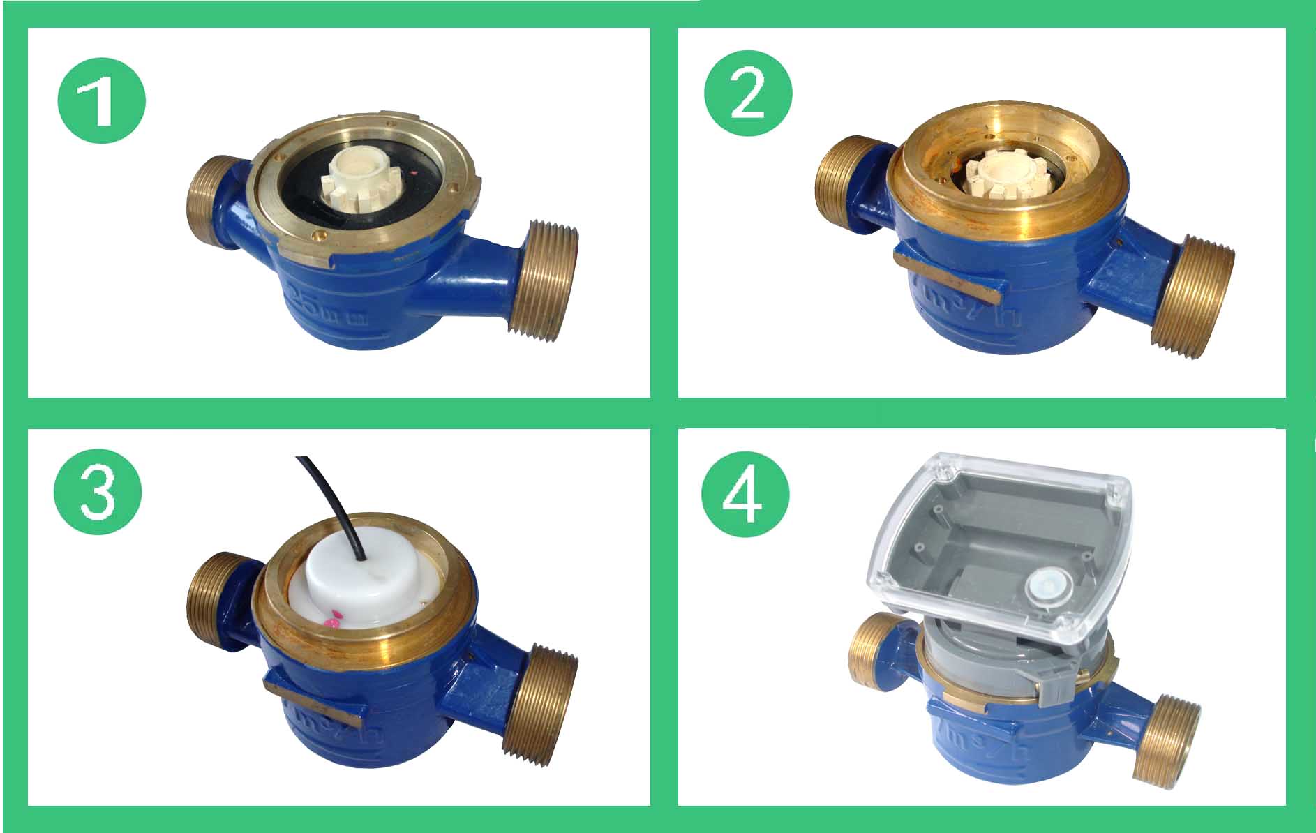 單(dān)流束有磁熱量表流量計的結構如圖,其工作原理是:熱水進入流量計,經進(jìn)水導向孔(kǒng)衝擊計量腔內(nèi)的葉輪(lún)旋轉,再經出水(shuǐ)導(dǎo)向孔流出流量計(jì)。葉輪上麵(miàn)嵌有磁鋼隨葉輪旋轉,在隔板上端的韋根遠(yuǎn)傳組件,接(jiē)受葉輪旋轉的周期信號。單(dān)流束有磁熱量表流(liú)量計的殼體采用優質黃銅,經金屬模(mó)鑄(zhù)造、數控機床和組合(hé)機床加工,機械強度好、尺寸精度穩定一致,塑料零件選用進口的高強度耐熱工程塑料,密封件采用優質耐熱材料。因(yīn)此,該流量計完全能(néng)夠適應國內供熱係統(tǒng)的惡劣工(gōng)作環境。