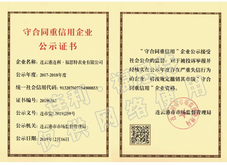 連利·福思特表業(yè)榮獲2017-2018年(nián)度連雲港市 “守合同(tóng)重信用”企業稱號