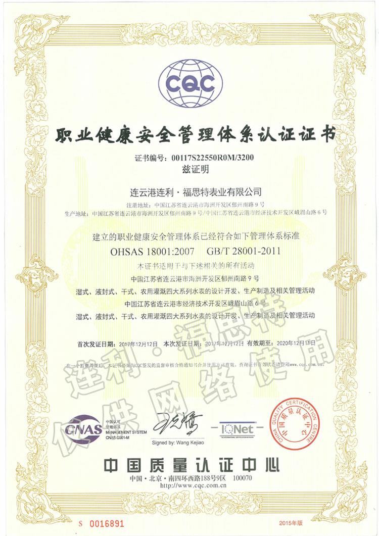 職(zhí)業健康安全管(guǎn)理(lǐ)體係認證證(zhèng)書