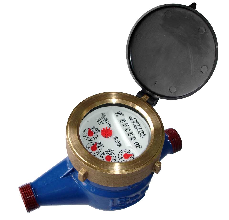 防滴漏(lòu)水表和普通水表不同之處在於防滴(dī)漏水表(biǎo)內部裝有自重閥、葉輪盒上有一節流孔。當用戶在正常流量範圍內用(yòng)水時水(shuǐ)流衝開自重閥,水通過自重閥(fá),流經(jīng)葉輪盒進水孔多點衝擊葉輪,驅動葉輪旋轉,從而實現(xiàn)對流量的準確計量。當流(liú)量低於某一水流能量(如2L/h),水流能量不(bú)足以克服自重閥重力,而自重閥關閉時,水流通過葉輪盒上節流孔推(tuī)動葉輪轉動從而開始計(jì)量水量。