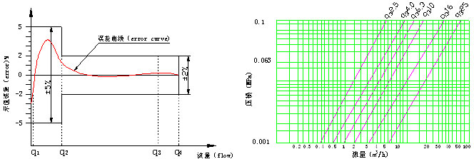 示值誤差限與流量曲線FLOW-ERROR CURVE                                       壓力損失曲(qǔ)線 Pressure loss curve